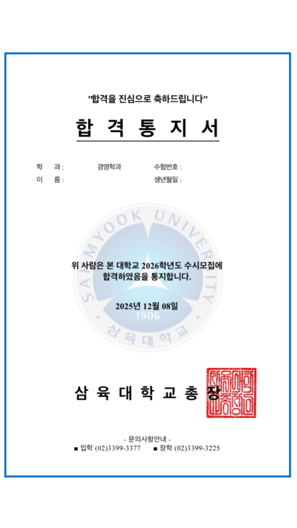 가천대 법학과 (불합) 삼육대 경영학과(최초합) 상명대 화학에너지공학(예비) 국민대 정치외교학과(불합) 수원대 영어영문학과(미응시) 지원했습니다