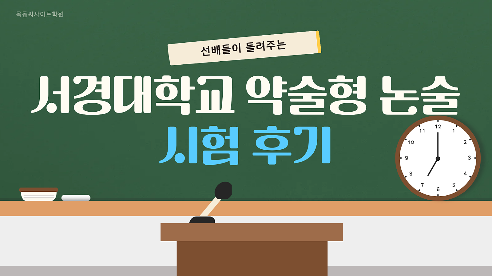 서경대 약술형 논술 시험날이 어느새 내일로 다가왔습니다. 서경대 논술은 약술형 논술 전형이 있는 학교 중에 가장 먼저 치뤄지는데요. 약술형논술 전형을 선택한 학생들을 위해 목동씨사이트학원에서 선배들의 시험 후기를 준비했습니다! 목동씨사이트학원 선배들이 직접 작성한 글이니 놓치지 마시고 좋은 꿀팁 가득 얻어가시길 바랍니다.
