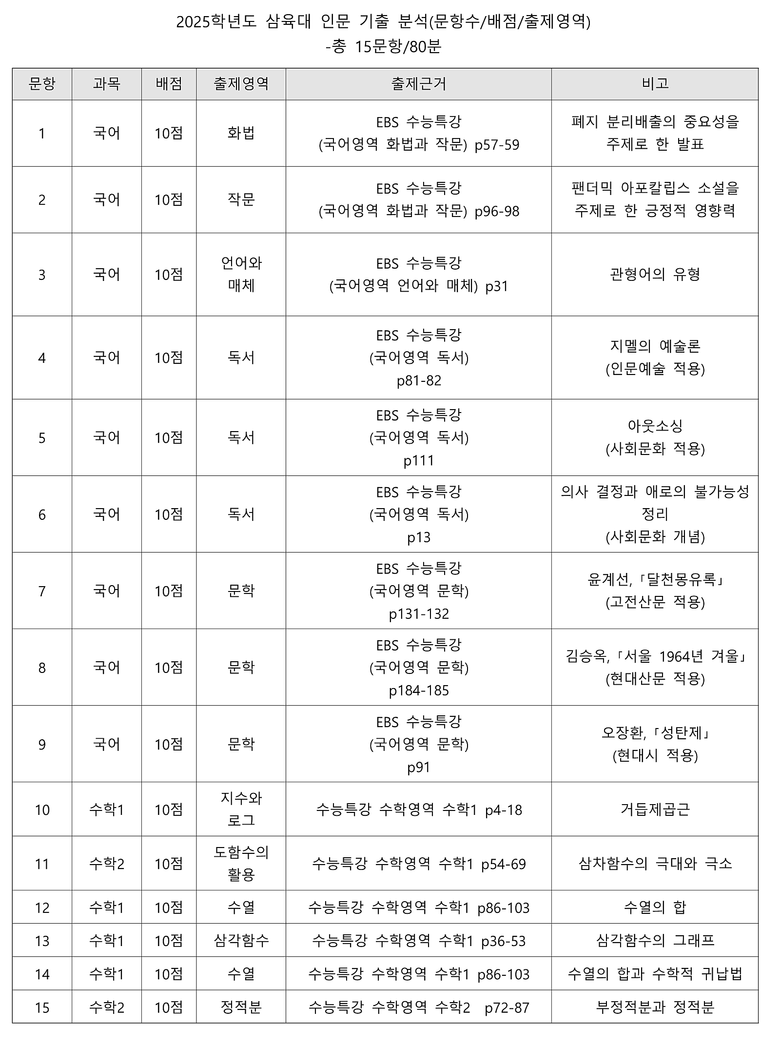 2025학년도 삼육대 인문 기출 분석 (문항수/배점/출제영역) 페이지 정보 작성자 목동씨사이트 댓글 0건 조회 2회 작성일 25-11-11 21:24 본문 2025학년도 삼육대 인문 논술 기출 분석안녕하세요, 목동씨사이트 학원입니다.삼육대 논술은 총 15문항 80분 구성으로,국어와 수학 모두 EBS 수능특강 교재 중심 출제가 특징이에요.국어는 화법·작문·독서·문학 전 영역에서 고르게 출제되었으며,EBS 문학 작품이 실제로 반영되었습니다.수학은 수Ⅰ·수Ⅱ 전 범위에서기본 개념 이해와 풀이력 중심으로 구성되어 있어요.이미지를 참고해 출제 경향을 꼭 확인해 보세요! 목록 이전글2025학년도 삼육대 자연 1세트 기출 분석 ! (문항수/배점/출제영역) 25.11.11 다음글2026학년도 국민대 논술 예상문제 자연 (문항수/배점/출제영역) 25.11.11 댓글목록 댓글목록 등록된 댓글이 없습니다.