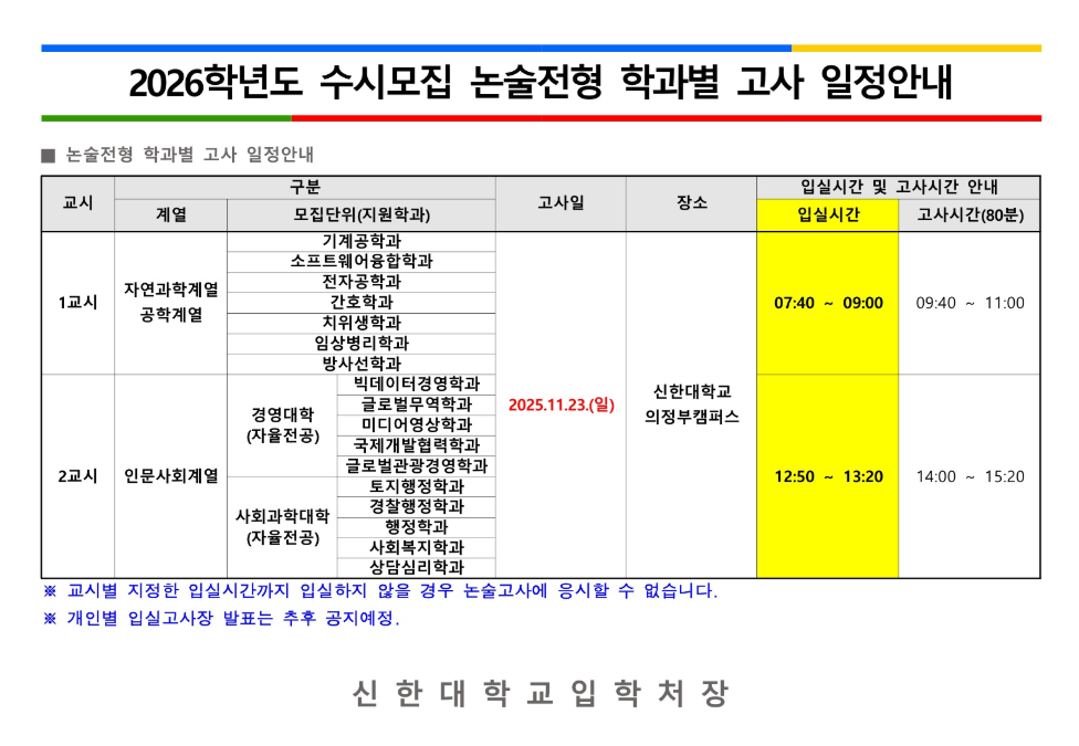2026 신한대 논술 학과별 고사 일정 페이지 정보 작성자 목동씨사이트 댓글 0건 조회 7회 작성일 25-11-22 16:01 본문 2026 신한대 논술 학과별 고사 일정 참고하셔서 시험에 도움이 되시길 바랍니다. 목록 이전글2026 신한대 논술 유의사항 25.11.23 다음글2026 고려대 세종 논술 답안 작성 유의사항 25.11.21 댓글목록 댓글목록 등록된 댓글이 없습니다.
